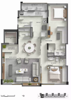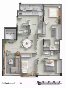 • Apartamentos de 3 quartos, sendo 1 suíte, com plantas funcionais e boa integração dos ambientes