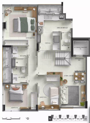 01 SUÍTE COMPOSTA DE QUARTO E BANHEIRO, 02 QUARTOS, BANHEIRO SOCIAL, LAJE TÉCNICA, CIRCULAÇÃO, SALA DE ESTAR, COZINHA CONJUGADA COM ÁREA DE SERVIÇO, BANHEIRO DE SERVIÇO E ESCADA DE ACESSO A COBERTURA E COBERTURA INDIVIDUAL COMPOSTA DE: LAZER, BANHEIRO, CHURRASQUEIRA, TERRAÇO DESCOBERTO, DECK E SPA