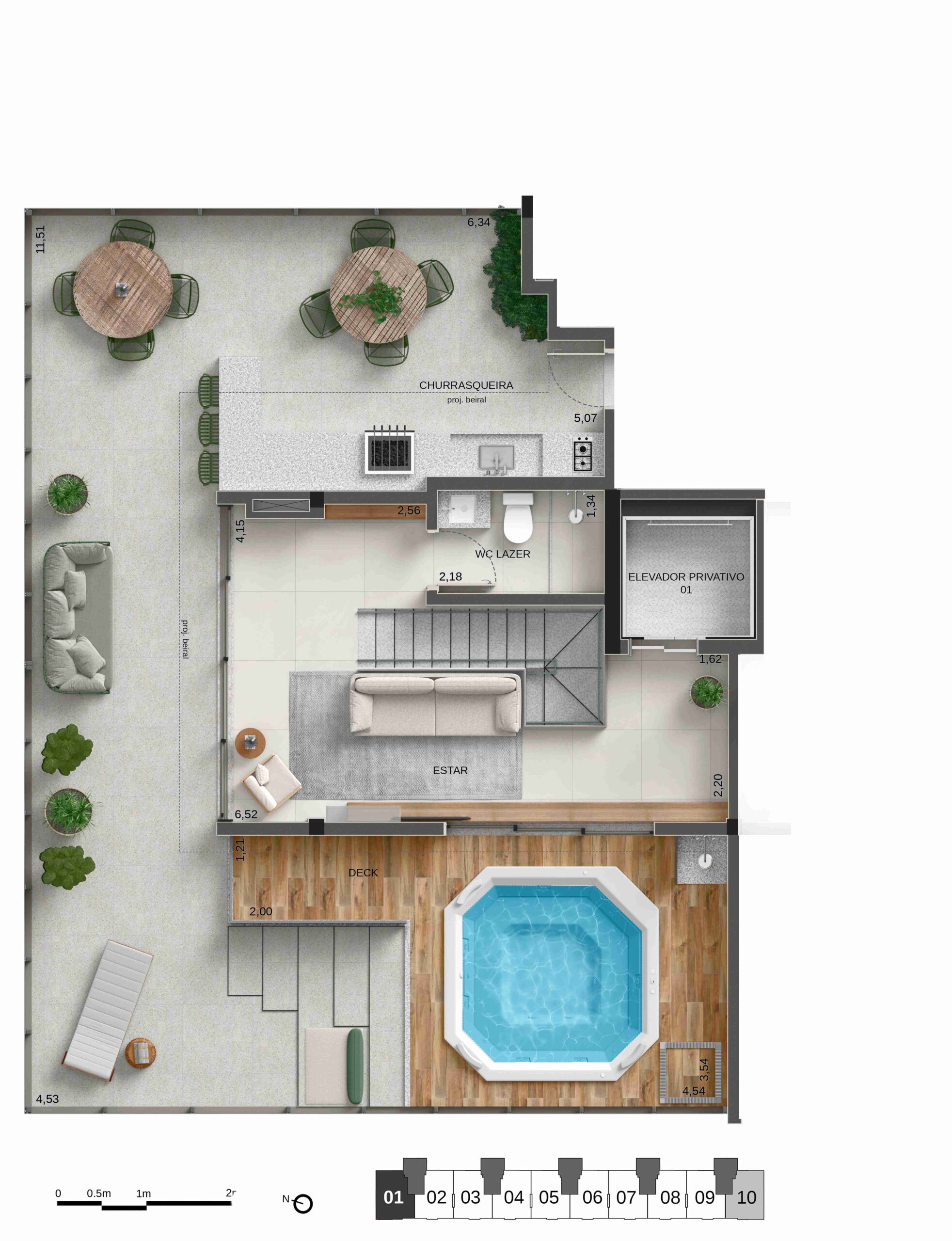 COBERTURA INDIVIDUAL COMPOSTA DE: LAZER, BANHEIRO, CHURRASQUEIRA, TERRAÇO DESCOBERTO, DECK E SPA
