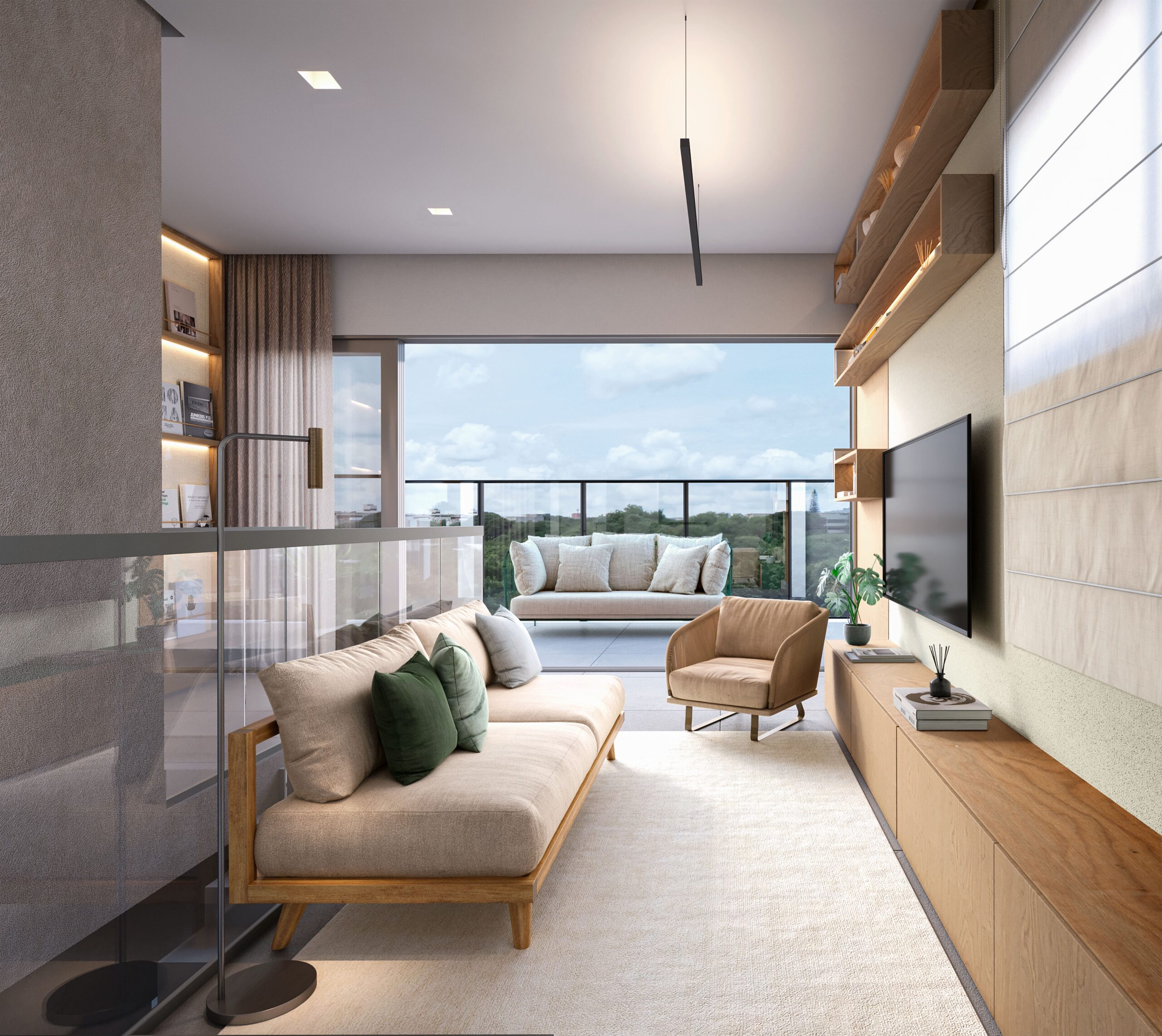 • UNIDADE MEIO PAVIMENTO TIPO PERSPECTIVA DA SALA DE ESTAR